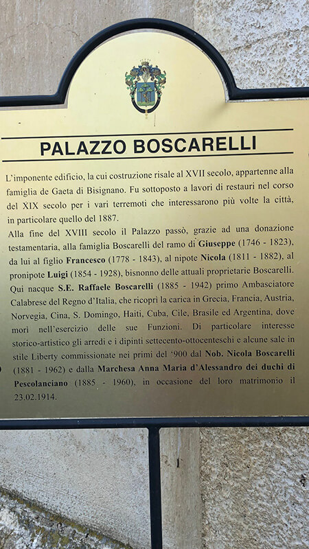 Le date storiche della famiglia Boscarelli diventano così tappe di un tragitto che attraversa il tempo e segna i confini della storia di Bisignano e del suo territorio in Calabria, in un legame indissolubile che dura ancora oggi.